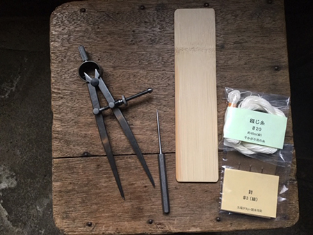 製本用の麻の糸や、先が丸くなった製本用の針、