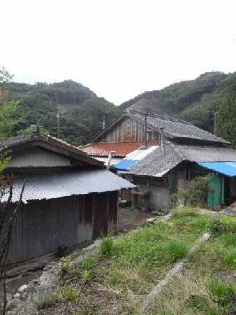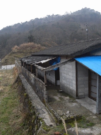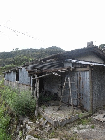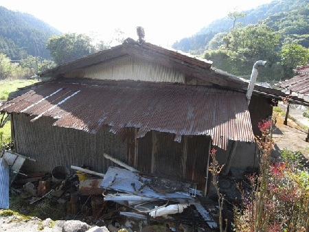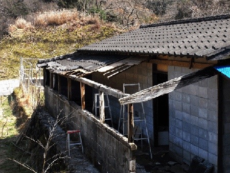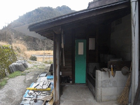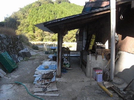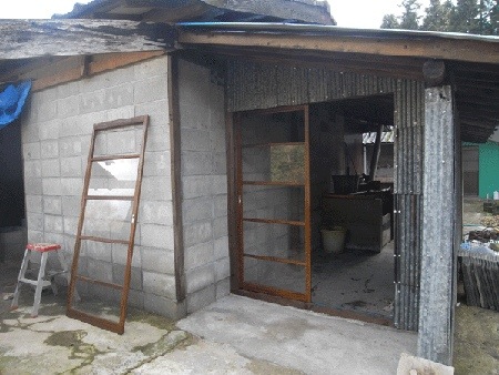 向こうに見える家と同じようにペンキを塗ったトタンを打ちつけて、